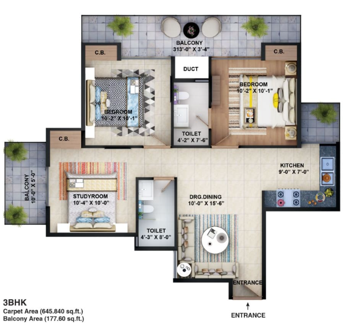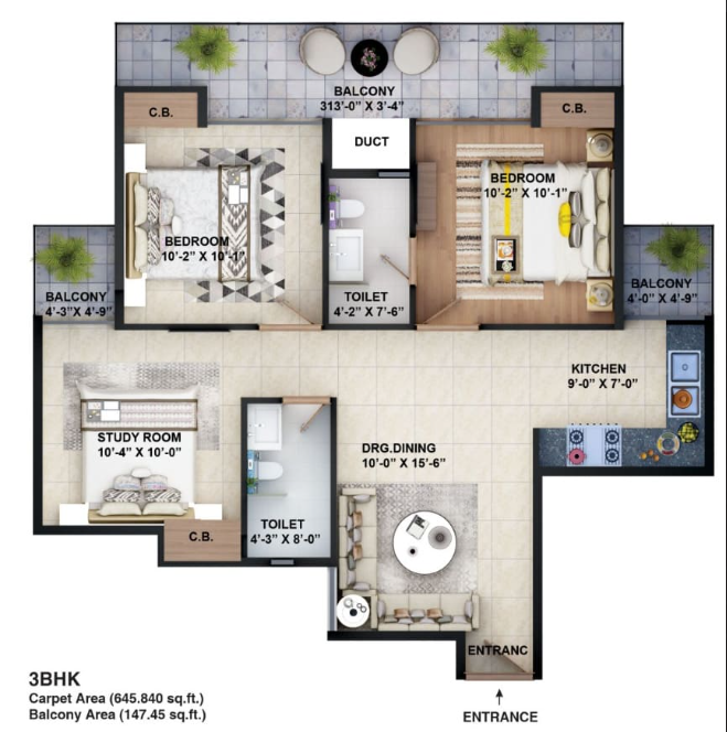 - Carpet Area: approx. 645 sq. ft.